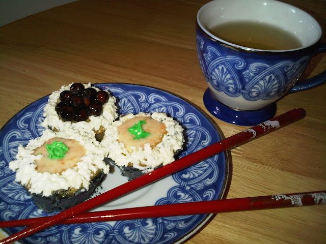 Inspired by Sushi, I made the following in to a sweet maki: White mini cupcake filled with Carrot Ice- Cream and Tapioca Bubbles frosted with Soy Sauce Cream Cheese Frosting, .